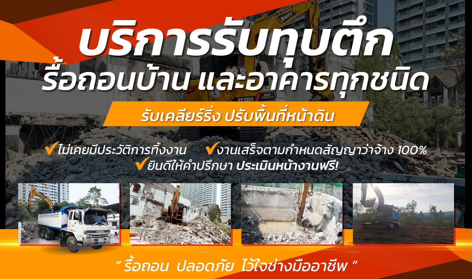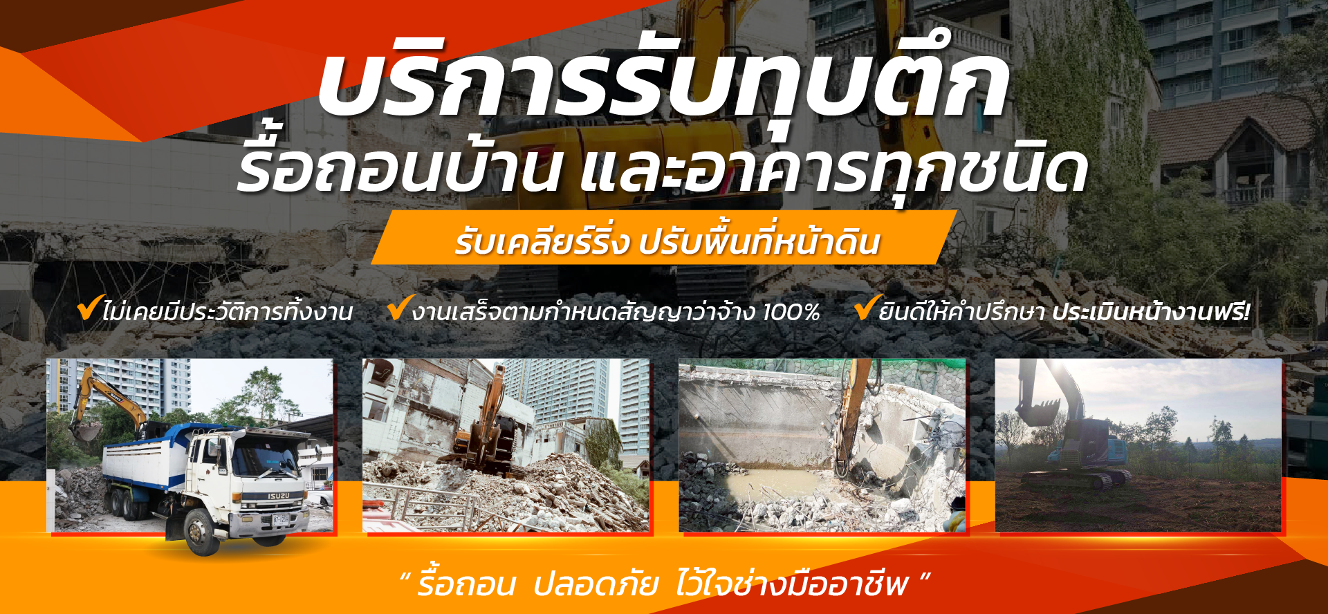 บริษัท ชัยญะพรคอนสตรัคชั่น แอนด์ดิสแมนเทิล จำกัด เราคือผู้ให้บริการ ทุบตึกและรื้อถอน ด้วยทีมงานมืออาชีพที่มีประสบการณ์ มากมายเราพร้อมให้บริการคุณในทุกขั้นตอนตั้งแต่การประเมินพื้นที่ จนถึงการทำความสะอาดหลังการรื้อถอนพร้อมเครื่องมือทันสมัย เพื่อให้การทำงานเสร็จสิ้นอย่างรวดเร็วและปลอดภัยที่สุด บริษัท ชัยญะพรคอนสตรัคชั่นแอนด์ดิสแมนเทิล จำกัด เราคือผู้ให้บริการ ทุบตึกและรื้อถอน ด้วยทีมงานมืออาชีพที่มีประสบการณ์ มากมายเราพร้อมให้บริการคุณในทุกขั้นตอนตั้งแต่การประเมินพื้นที่ จนถึงการทำความสะอาดหลังการรื้อถอนพร้อมเครื่องมือทันสมัย เพื่อให้การทำงานเสร็จสิ้นอย่างรวดเร็วและปลอดภัยที่สุด ทำไมต้องเลือกใช้บริการจากเรา? ● การทำงานที่ปลอดภัยและมีมาตรฐาน ความปลอดภัยเป็นสิ่งที่เราให้ความสำคัญที่สุดในทุกขั้นตอน มีการวางแผนและดำเนินงานอย่างรอบคอบ ● ประสบการณ์และความเชี่ยวชาญ ทีมงานมืออาชีพที่มีประสบการณ์ในการทุบตึกและรื้อถอนทุกประเภท ไม่ว่าจะเป็นอาคาร บ้านเรือน หรือโครงสร้างขนาดใหญ่ ● การบริการที่รวดเร็วและตรงเวลา รับประกันว่าการดำเนินงานจะเสร็จสิ้นตามเวลาที่กำหนด ไม่เสียเวลาของลูกค้า บริการของเรา บริการรับทุบตึก รื้อถอนบ้านและอาคารทุกชนิด บริการรับทุบตึก รื้อถอนบ้านและอาคารทุกชนิด เรามีทีมงานมืออาชีพที่พร้อมให้บริการ ทุบตึก และ รื้อถอนบ้านหรืออาคาร ทุกประเภท ด้วยประสบการณ์และความเชี่ยวชาญในงานรื้อถอน ทำให้เราสามารถให้บริการที่มีคุณภาพ ปลอดภัย และมีประสิทธิภาพ บริการของเราประกอบด้วย ทุบตึกและอาคารพาณิชย์ เราดำเนินการทุบตึกเก่า อาคารพาณิชย์ อาคารสูง หรือสิ่งปลูกสร้างที่ไม่ต้องการอย่างครบวงจร ติดต่อเรา รื้อถอนบ้านและทาวน์เฮ้าส์ บริการรื้อถอนบ้านเดี่ยว ทาวน์เฮ้าส์ หรือที่อยู่อาศัยทุกประเภท ติดต่อเรา การรื้อถอนสิ่งปลูกสร้างทุกชนิด ไม่ว่าจะเป็นอาคารโรงงาน โกดัง หรือพื้นที่เชิงพาณิชย์ เรามีความเชี่ยวชาญในการทำงานทุกรูปแบบ ติดต่อเรา ขั้นตอนการบริการ ประเมินพื้นที่ ทีมงานจะทำการสำรวจและประเมินพื้นที่ที่ต้องการรื้อถอน เพื่อจัดทำแผนการทำงาน การรื้อถอน เริ่มดำเนินการรื้อถอนด้วยเครื่องมือที่ทันสมัย และปลอดภัย การทำความสะอาด หลังจากการรื้อถอนเสร็จสิ้นเราจะทำการทำความสะอาดพื้นที่ให้เรียบร้อย พื้นที่ให้บริการ กรุงเทพฯ ปริมณฑล ชลบุรี ระยอง ฉะเชิงเทรา ผลงานที่ผ่านมา